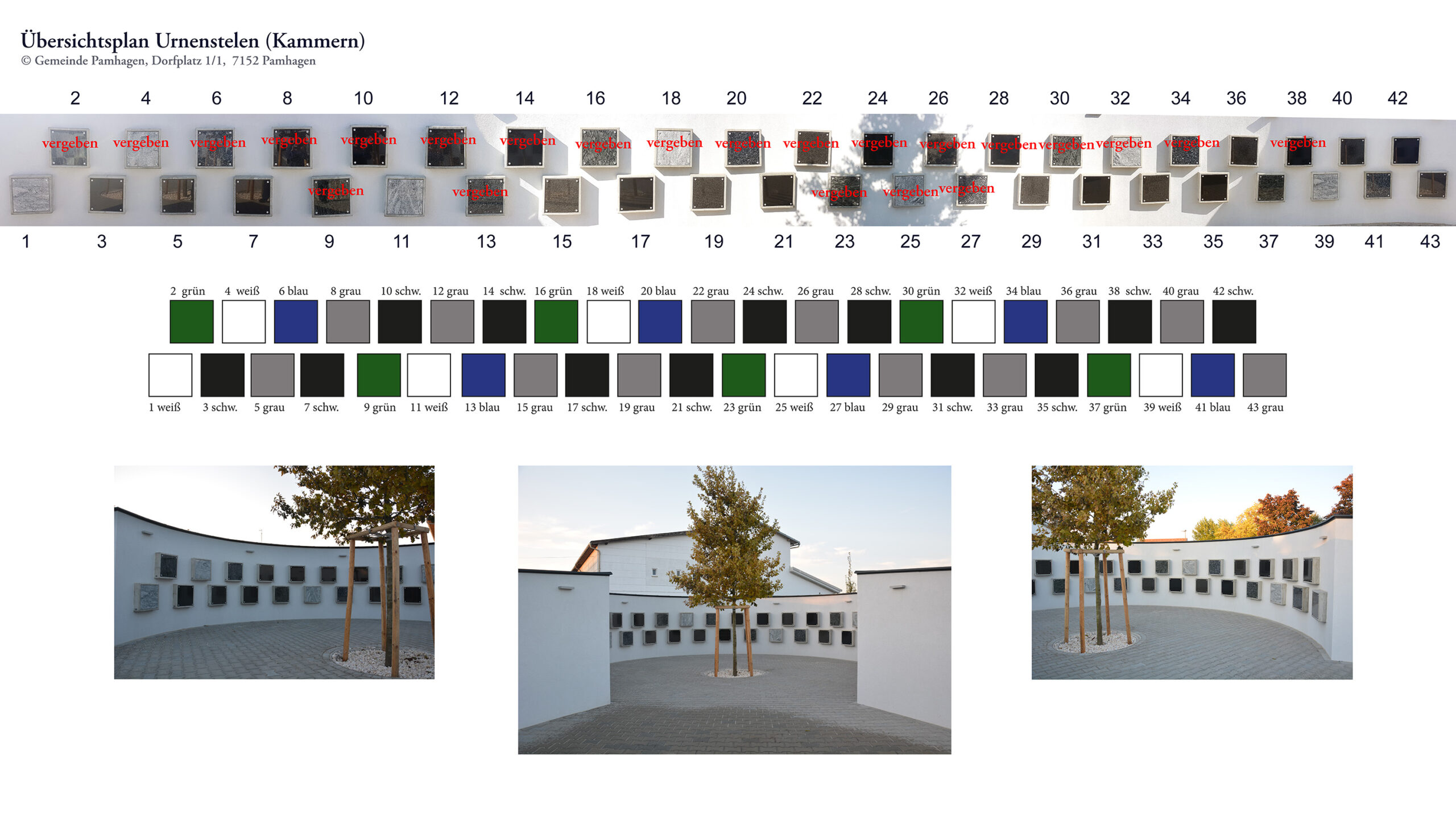 Nachfolgend finden Sie eine Übersicht der Urnenstelen (Kammern). Die bereits vergebenen Urnenstelen (Kammern) wurden markiert.